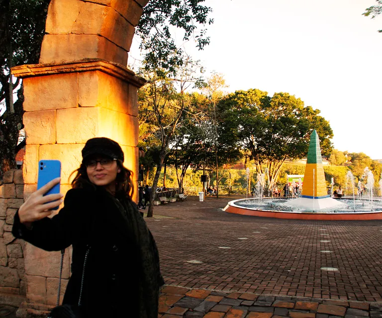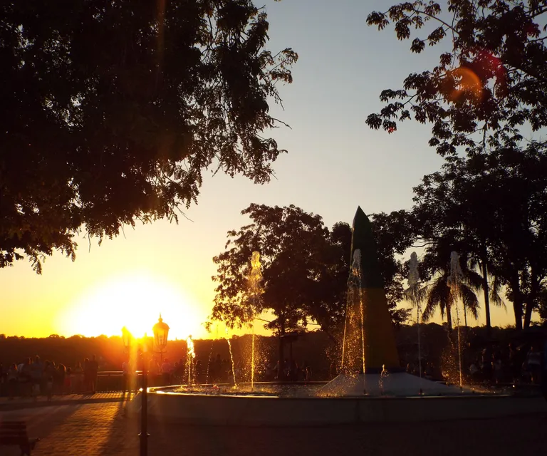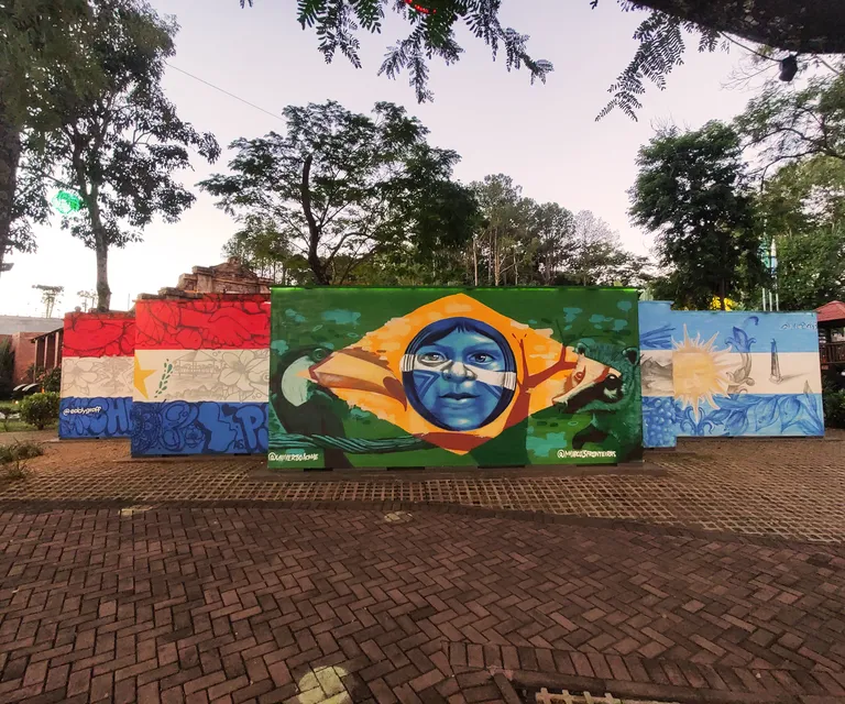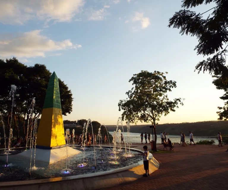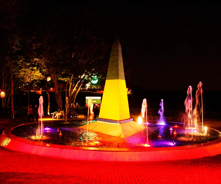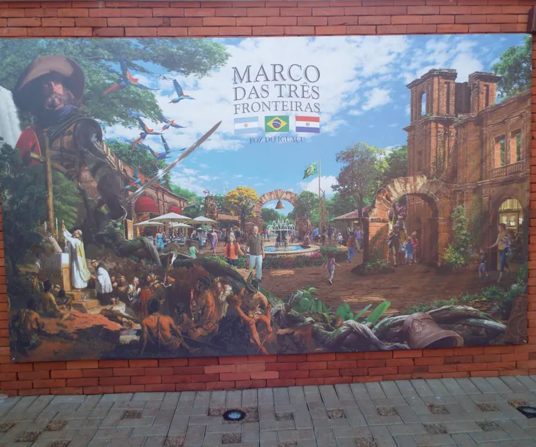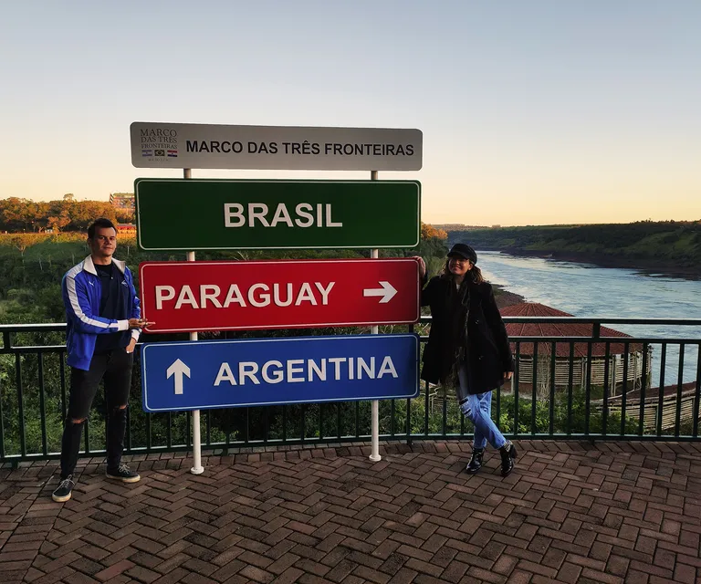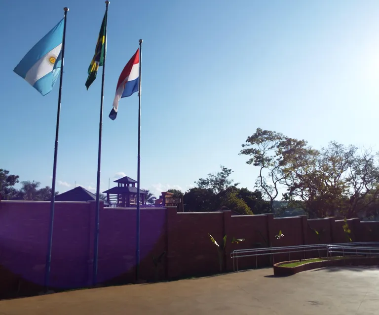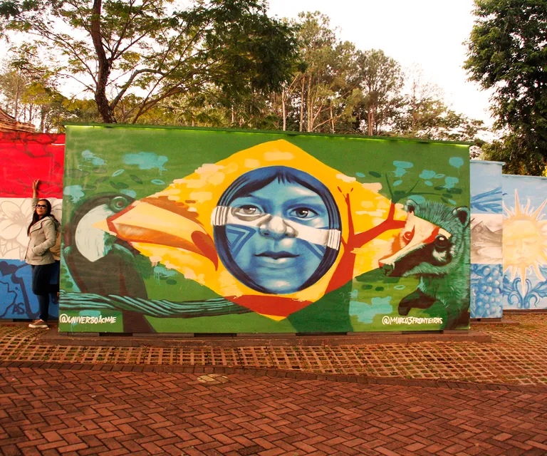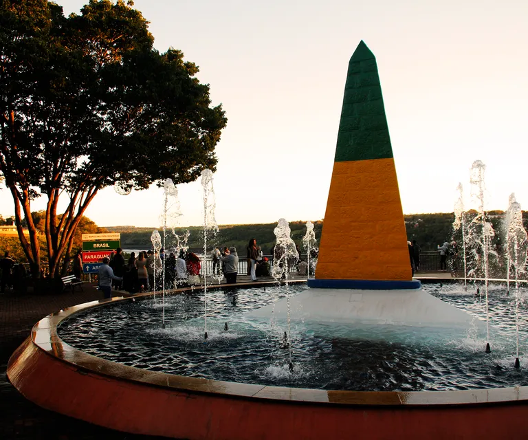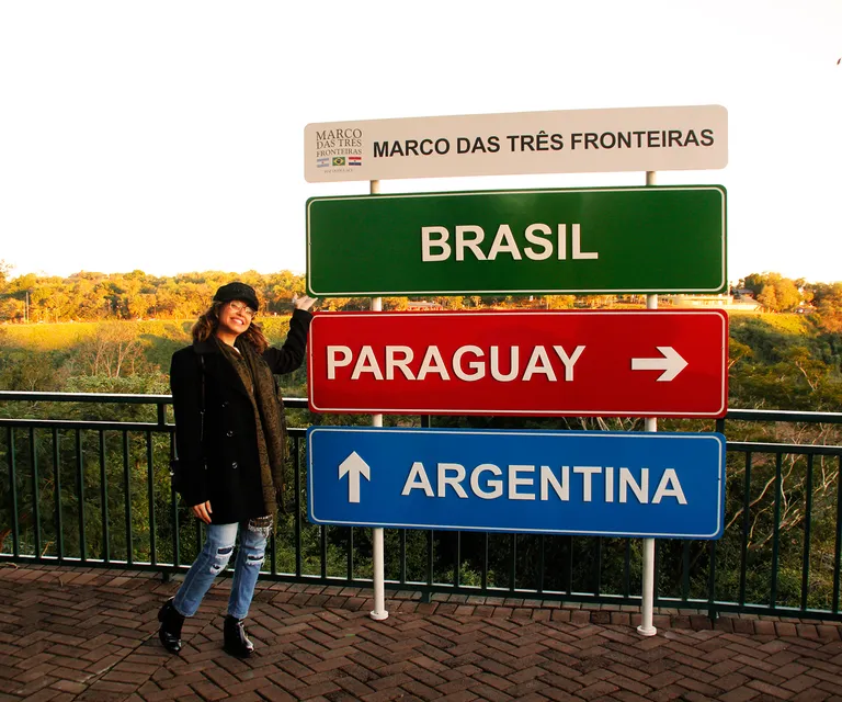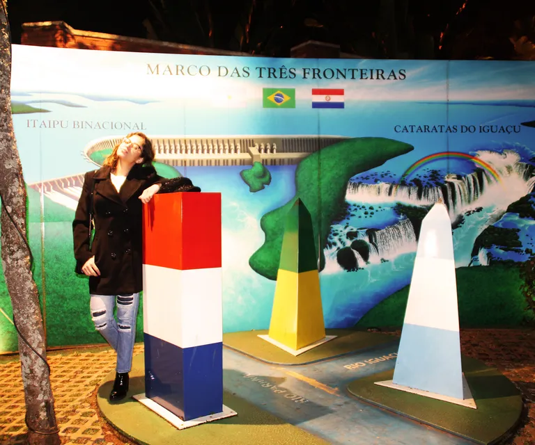 No marco pintado em azul, amarelo e verde, as cores da bandeira brasileira, você estará de pé na fronteira com os países do Paraguai e Argentina.